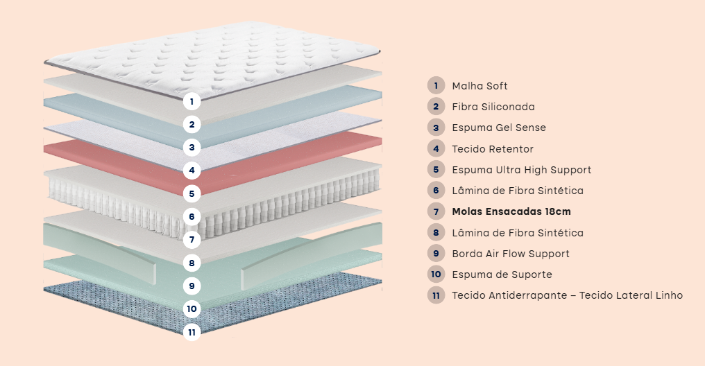 As molas são ensacadas individualmente, garantindo que os movimentos de uma pessoa não perturbem o sono da outra. Fabricadas com fio de aço especial 2 mm, alto teor de carbono e tecnologia tri-temperado, apresentam alta durabilidade, adaptabilidade ao corpo e excelente memória no aço. Com altura de 18 cm, entregam firmeza, estabilidade e ergonomia para biotipos de até 150 kg por pessoa.
