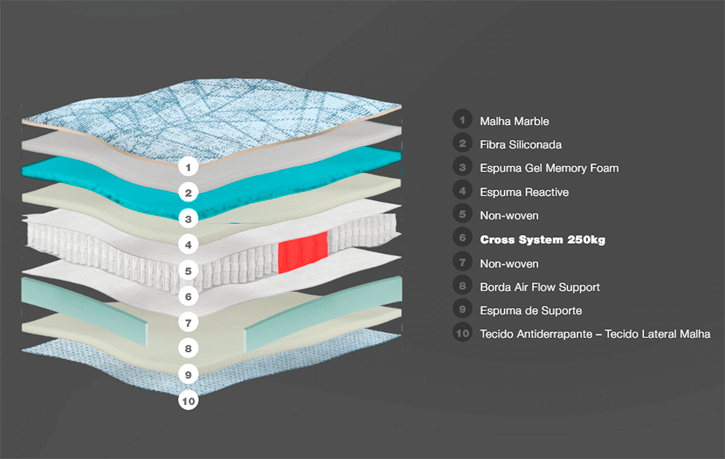 Mola Cross System 250kg: Sistema de molas ensacadas com terço central reforçado, criando três zonas distintas para melhor adaptação à coluna vertebral.