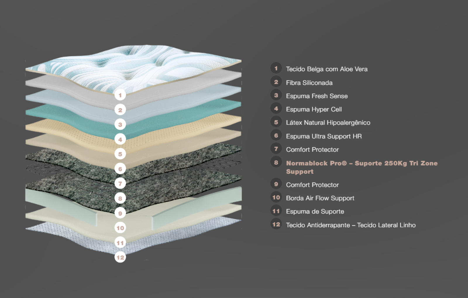 Espumas Hyper Cell e Cool Touch: Oferecem maciez superior e resiliência, mantendo o arejamento e conforto térmico.