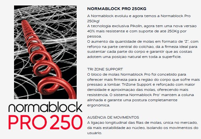 O Colchão Vibration Pikolin foi desenvolvido para quem busca máximo suporte, firmeza estrutural e alta durabilidade. Com 30 cm de altura, conforto Extra Firm e o exclusivo sistema de molas Normablock Pro®, que suporta até 250 kg por pessoa, oferece estabilidade superior, ergonomia avançada e sustentação reforçada na região lombar. Seu tecido belga com tecnologia Purotex® mantém o colchão naturalmente protegido contra ácaros e alérgenos, tornando-o uma excelente escolha para quem prioriza saúde, resistência e qualidade de sono.